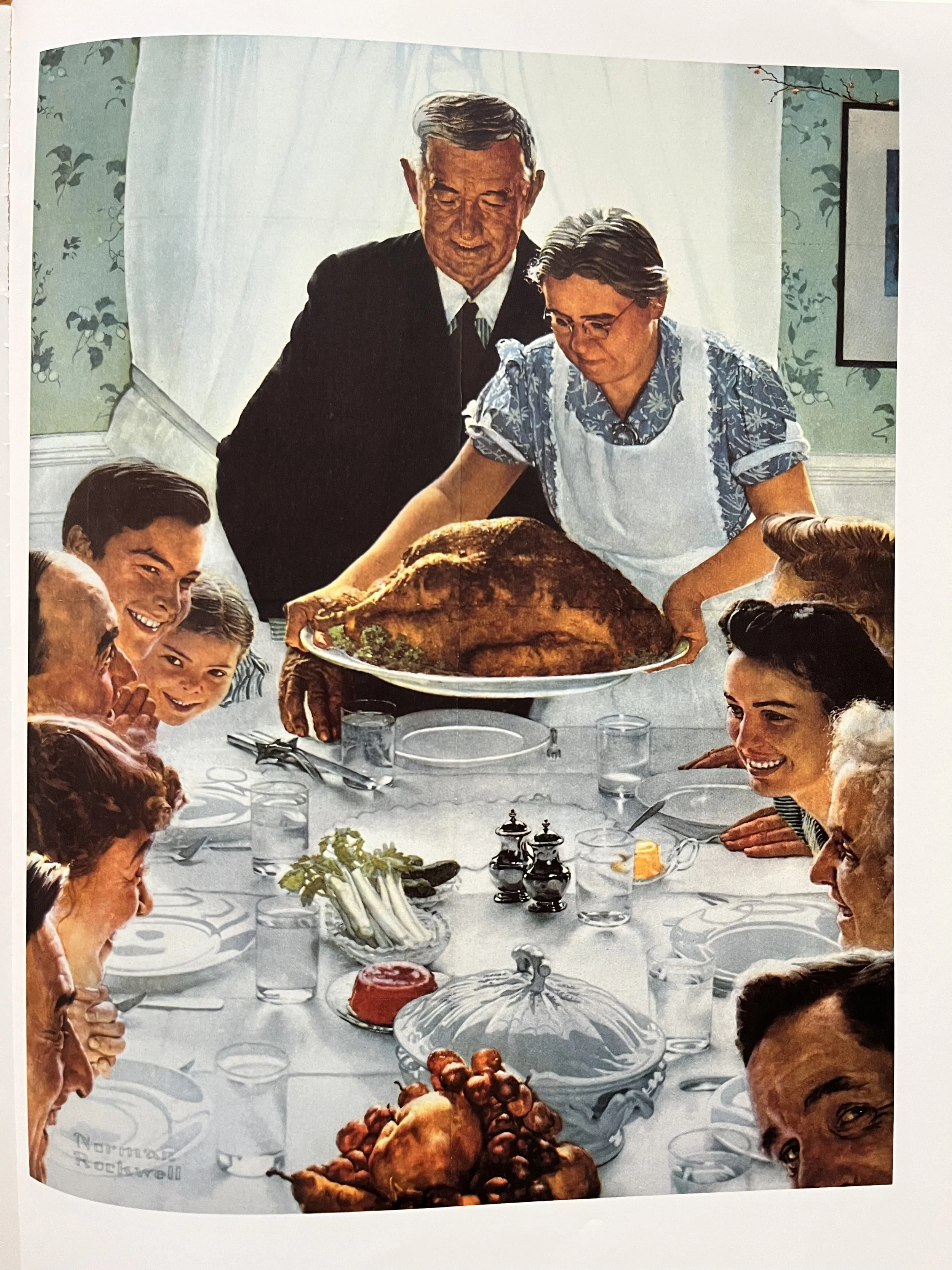 After painting Freedom of Speech and Freedom of Worship, Rockwell proceeded easily with the next two freedoms. On Thanksgiving Day he photographed his cook, Mrs. Wheaton, as she presented the turkey to the family at the table. She “cooked it, I painted it, and we are it,” Rockwell reported. “That was one of the few times I’ve ever eaten the model.” In addition to the family cook, the artist also included two Rockwells in the picture - Rockwells wife, Mary, on the left and his mother on the right.